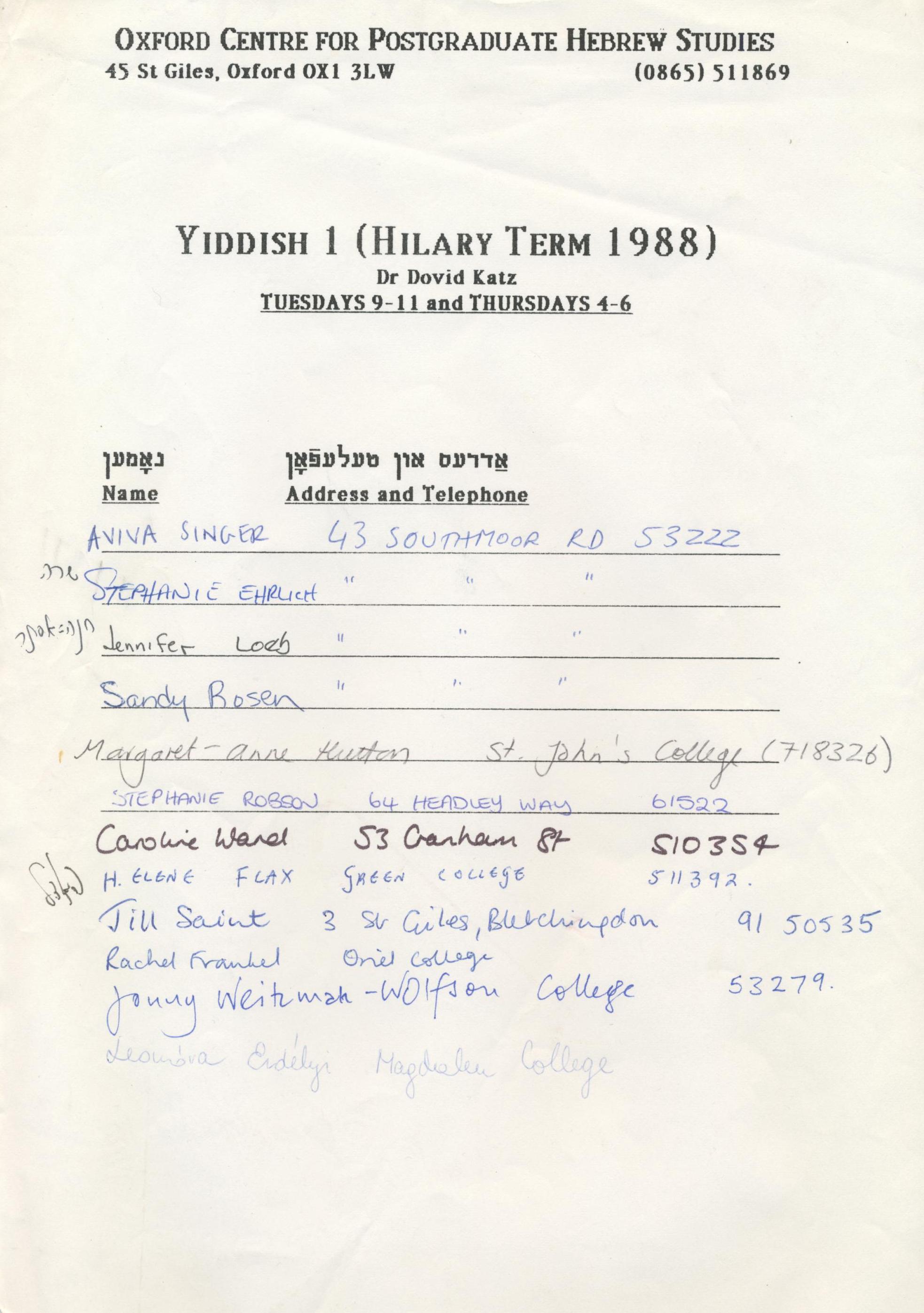 1981 Nov 18 London Times 1982 leaflet 1982 April 30 Jewish Chronicle 1982 May 7 Cleveland Jewish News 1982 June 15 Undzer Vort Sh. Levenberg in Forverts 1982 Aug 28 Oxford Mail 1982 Sept 3 Jewish Chronicle 1982 Sept 3 Oxford Times 1982 Sept 10 Jewish Chronicle (Kalmen & Sabina) 1983 leaflet 1983 London Times 1983 First Stencl Lecture invitation 1983 12 Aug JC Report on First Stencl Lecture 1983 Summer Program diploma 1983 Aug 19 Jewish Chronicle 1983 Aug 20 party invitation 1983 Sept 9 Jewish Chronicle David & Takeo 1983 Sept 16 THES Kalmen & Sharman 1983 Sept 30 Jewish Chronicle Kalmen & Sharman 1983 Sept Jewish Week Kalmen & Sharman 1983 Oct 13 Jerusalem Post 1984 leaflet 1984 Aug 31 Jewish Chronicle Abraham Karpinovitch in Letste nayes 1985 leaflet 1985 July 5 Jewish Chronicle 1985 August 3 teachers' meeting 1985 activities sheet 1985 diploma 1985 press release 1985 Aug 16 Jewish Chronicle 1985 Aug 30 Jewish Chronicle 1985 Sept 20 Forward 1986 June 6 Forward 1987 leaflet 1987 October 7 Yidishe tsaytung 1988 leaflet 1989 Summer Program Activities Sheet The Oxford Winter Symposium in Yiddish Studies